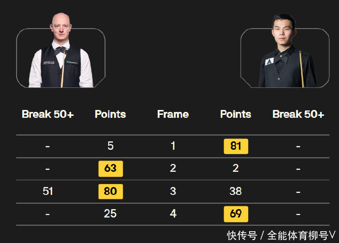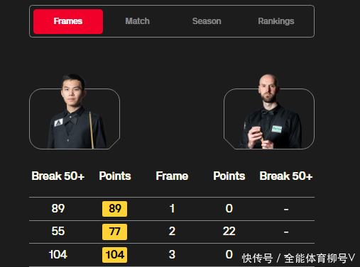 比赛第一局,刘宏宇一上来就找到火爆迫切手感,他打出单杆89分,89-0零封伯恩斯,1-0强势开局。第二局,刘宏宇连续用迫切压制伯恩斯,他又打出单杆55分,77-22再胜一局,2-0越过并得到两个赛点。